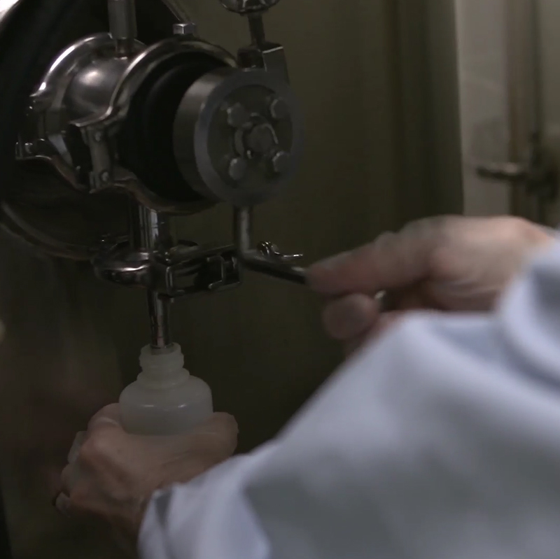 ボトルのエア洗浄から薬剤の充填、キャップの装着、さらにはカメラ検査まで、最新の機械が全自動で行います。