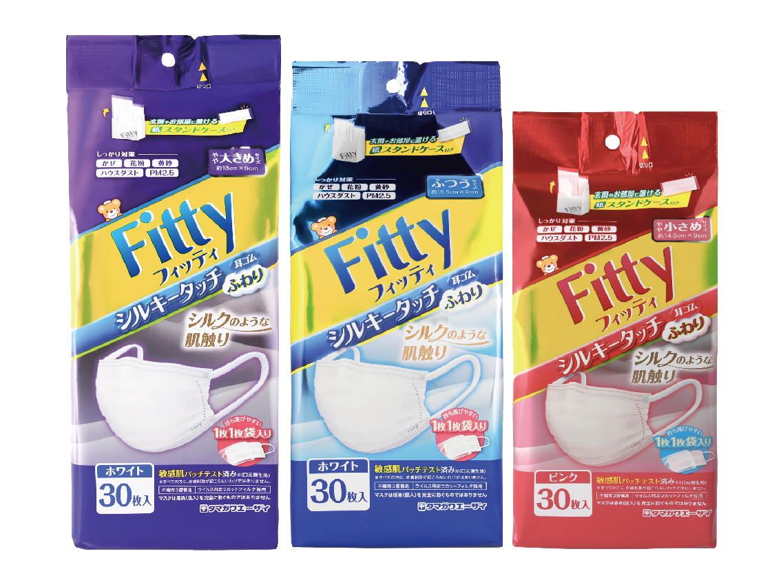 マスクサイズ:やや大きめ、ふつう、やや小さめ(ピンク)の3サイズ展開